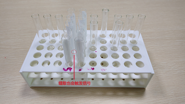 光學(xué)傳感器由于感應(yīng)原理的問題,時(shí)而會(huì)遇到檢測(cè)環(huán)境復(fù)雜,影響檢測(cè)的情況。我們最近遇到醫(yī)療設(shè)備客戶需要檢測(cè)座架上的試管,每一排位置的有試管都需要給出信號(hào),結(jié)果發(fā)現(xiàn)沒有背景的情況下,當(dāng)試管排布得比較多的兩排,背景抑制光電開關(guān)檢測(cè)縫隙時(shí)也會(huì)輸出信號(hào),信號(hào)無法正常斷開。