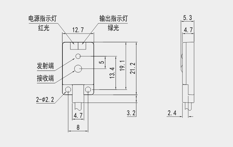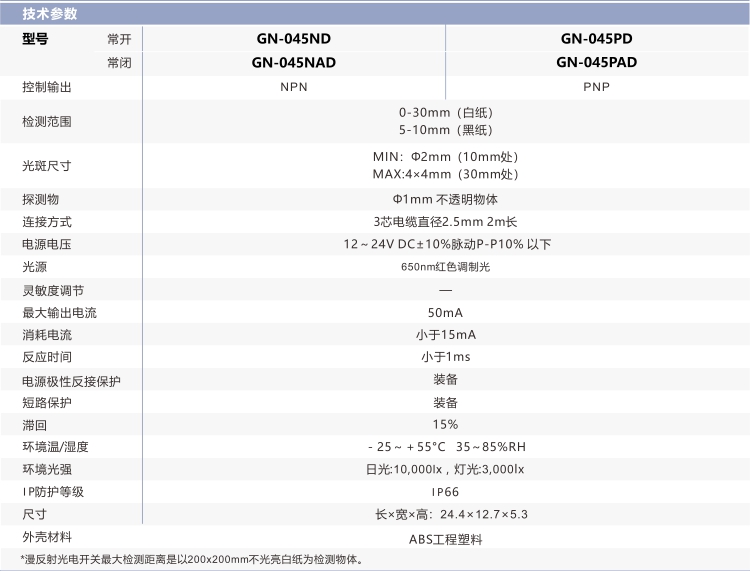 超薄型光電開關(guān)GN-045D系列采用小光斑尺寸設(shè)計(jì),檢測(cè)距離達(dá)到30mm,30mm處光斑僅為3*3mm; 配備方便觀察的雙色指示燈一一紅色電源指示燈與綠色輸出指示燈。