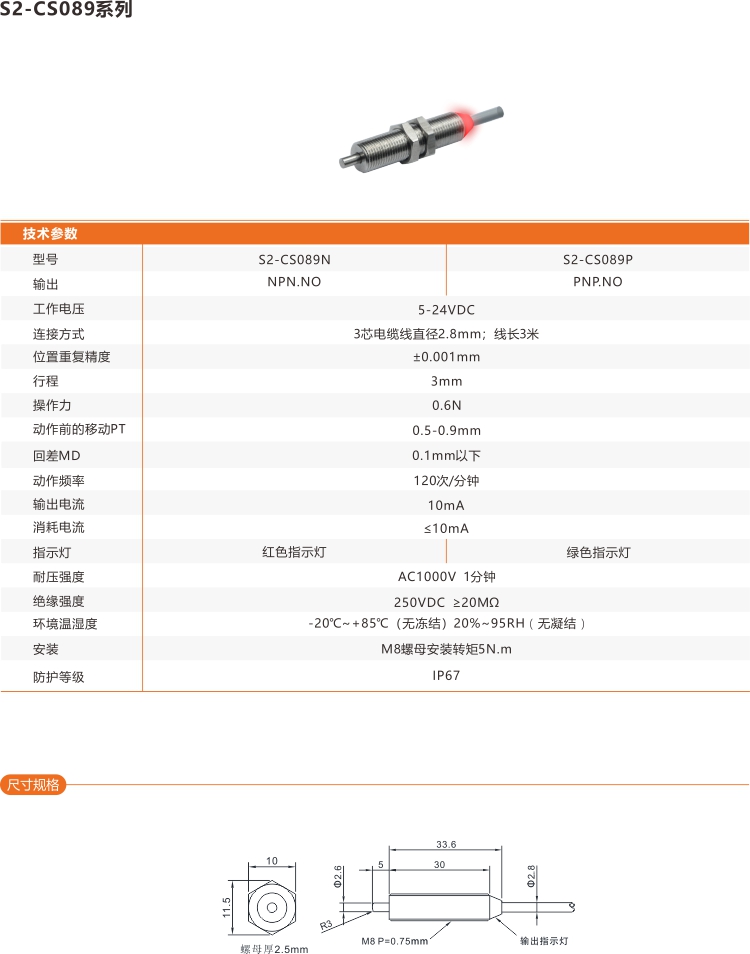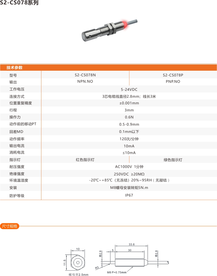 ECOTTER S2-CS 接觸定位開關是一種機械式位置檢測裝置,當物體與開關的接觸部件發(fā)生物理接觸時,開關會改變其電氣狀態(tài)(通/斷)。