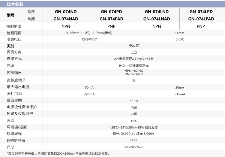 ECOTTER GN-07系列光電開關(guān) 提供了標(biāo)準(zhǔn)距離款與雙倍距離型號、上方檢測與前方檢測兩個(gè)檢測方向,可以根據(jù)不同的工況選擇對應(yīng)的款式。