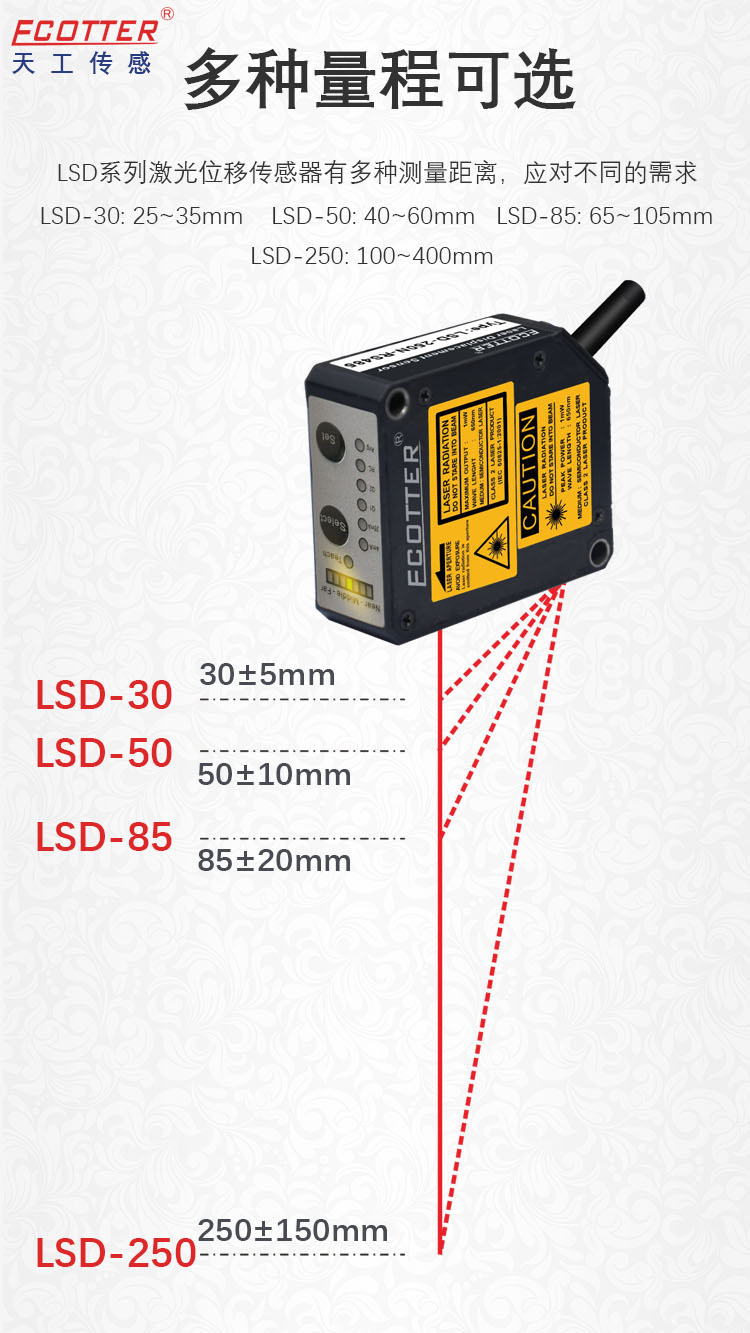 ECOTTER LSD系列 采用三角測量原理,激光束照射被測物體表面,反射光由接收透鏡聚焦到光敏元件。物體位移變化導致反射光斑位置移動,通過計算光斑位移量確定物體距離。