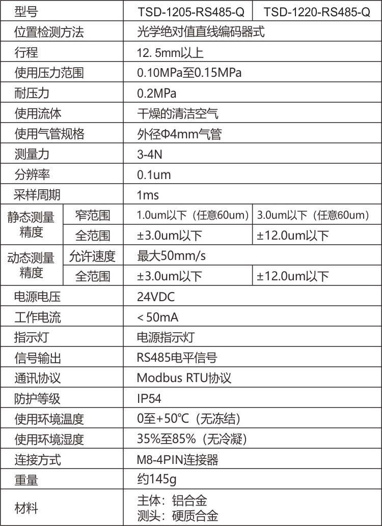 TSD-1205-RS485-Q為氣動(dòng)型,由氣管接口可接直徑4mm氣管,通0.12~0.17mpa氣壓推出探桿,測(cè)量精度可達(dá)3um。支持RS485 modbus rtu ,可高速返回?cái)?shù)據(jù)每秒1000次,實(shí)現(xiàn)動(dòng)態(tài)測(cè)量。