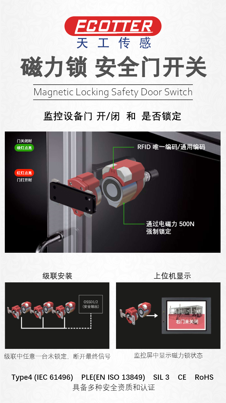 ML-500系列具有Type4 (IEC 61496)、PLE(EN ISO 13849)、SIL 3、CE、RoHS等多種安全資質(zhì)和認證,使用更放心。其鎖定力可達500N,具有抗干擾、防塵防水、耐腐蝕、高負載,適用于高安全性和惡劣工況需求。